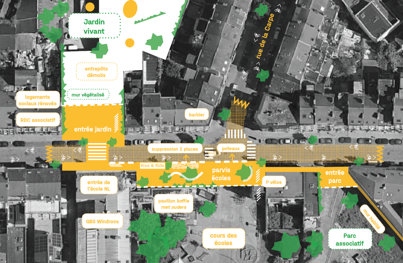 L'ambition centrale du processus est de donner la possibilité aux habitant·e·s et usagers·ères de réfléchir aux réaménagements futurs de leur rue, devant leur école... à travers une méthode de "testing" en grandeur nature dans l'espace public, permettant de préfigurer et de questionner les futurs aménagements de manière concrète et accessible à un maximum de monde : les élèves des écoles, les bénévoles du restaurant social, les habitant·e·s de l'îlot, les associations actives dans le quartier...